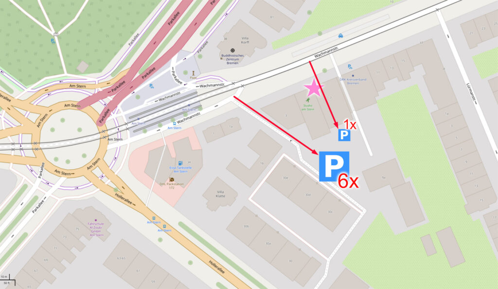 Hinter dem Studio-Gebäude findest du 6 Parkplätze, die eigens für das Studio reserviert sind.